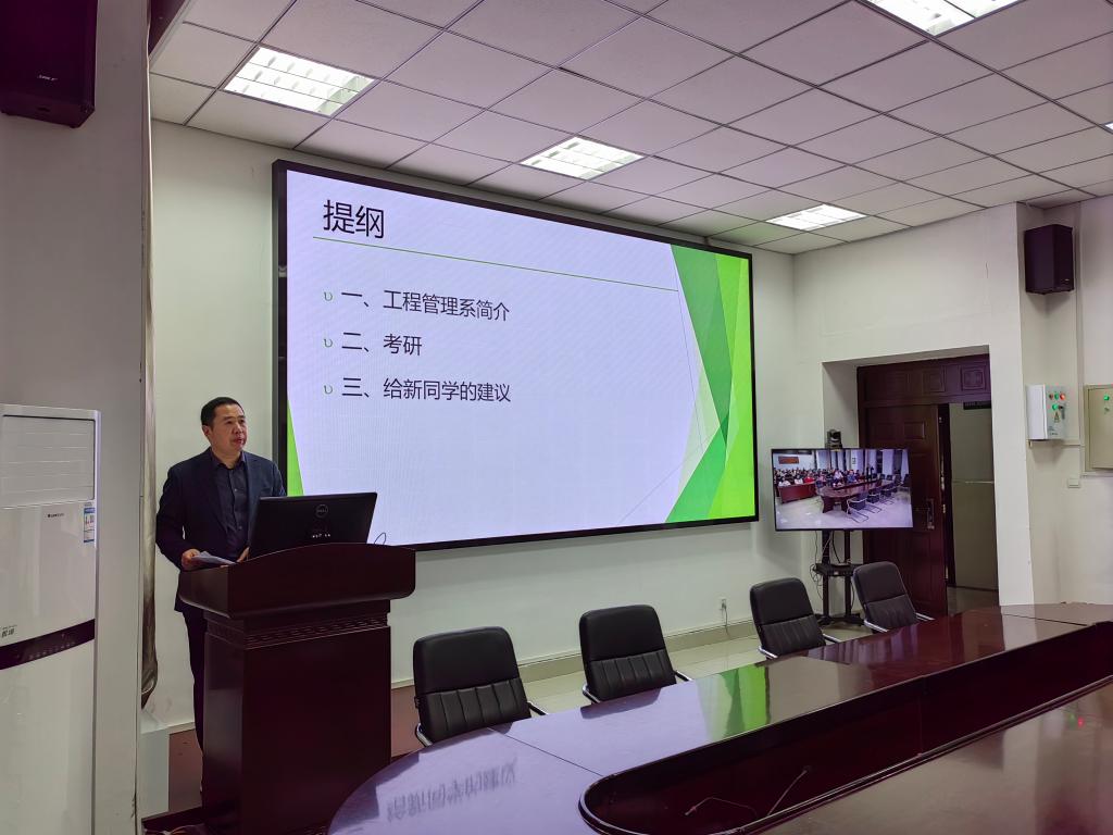 张宗领首先介绍了工程管理系的团队、办公地点、BIM中心,随后介绍了工程管理专业考研的方向、课程、过程及公司为同学们考研提供的服务,最后对新同学提出了建议,要求大家以学业为主,树立目标,合理安排时间,营造良好班风学风,不要沉迷手机游戏。