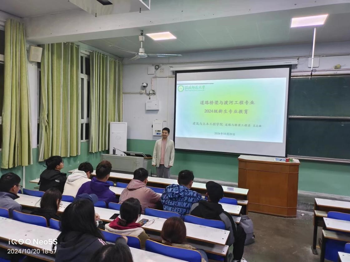 10月20日下午,道路与桥梁工程系在J2-T5教室举行了道路桥梁与渡河工程专业新生入学教育活动。道路与桥梁工程系负责人吴志强、系内部分教师代表及全体道路桥梁与渡河工程专业新生参加了活动。吴志强首先从国家交通强国战略出发,详细介绍了道路桥梁与渡河工程专业的发展现状和美好前景,鼓励新生坚定专业信心。随后,重点讲解了专业培养目标和课程体系,帮助新生更好地了解学业内容并做好学习规划。最后,教师代表们与新生就专业课程学习、继续深造、职业发展等问题进行了深入交流,并希望新生转变思想,变被动学习为主动学习,以崭新的积极姿态迎接老员工活,培养扎实的专业知识和实践能力,为将来成为优秀的道路桥梁与渡河工程师打下坚实基础。