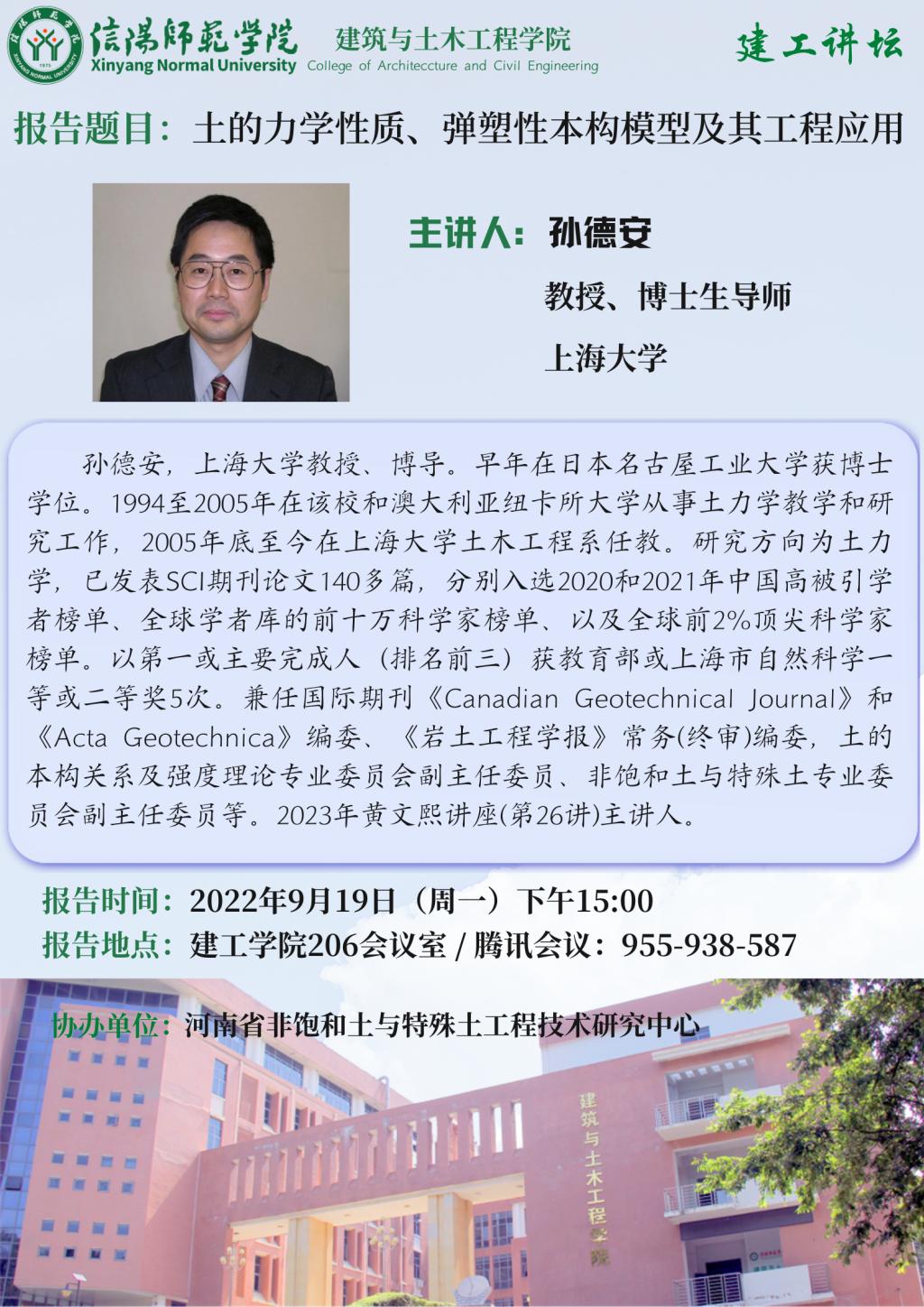 报告人简介:孙德安,上海大学教授、博导。早年在日本名古屋工业大学获博士学位。1994至2005年在该校和澳大利亚纽卡所大学从事土力学教学和研究工作,2005年底至今在上海大学土木工程系任教。研究方向为土力学,已发表SCI期刊论文140多篇,分别入选2020和2021年中国高被引学者榜单、全球学者库的前十万科学家榜单、以及全球前2%顶尖科学家榜单。以第一或主要完成人(排名前三)获教育部或上海市自然科学一等或二等奖5次。兼任国际期刊《Canadian Geotechnical Journal》和《Acta Geotechnica》编委、《岩土工程学报》常务(终审)编委,土的本构关系及强度理论专业委员会副主任委员、非饱和土与特殊土专业委员会副主任委员等。2023年黄文熙讲座(第26讲)主讲人。