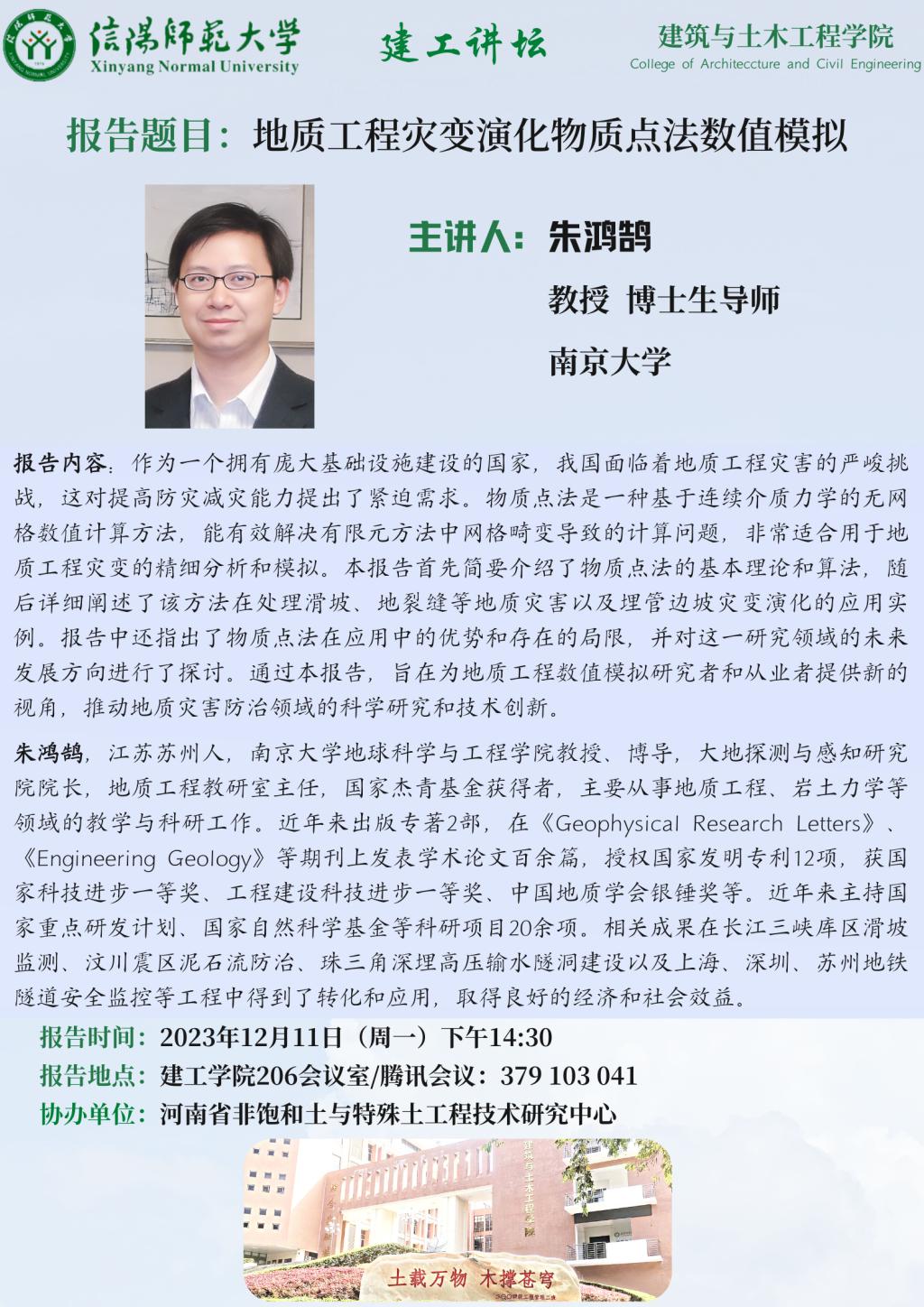 报告人简介:朱鸿鹄,江苏苏州人,南京大学地球科学与工程公司教授、博导,大地探测与感知研究院经理,地质工程教研室主任,国家杰青基金获得者,主要从事地质工程、岩土力学等领域的教学与科研工作。近年来出版专著2部,在《Geophysical Research Letters》、《Engineering Geology》等期刊上发表学术论文百余篇,授权国家发明专利12项,获国家科技进步一等奖、工程建设科技进步一等奖、中国地质学会银锤奖等。近年来主持国家重点研发计划、国家自然科学基金等科研项目20余项。相关成果在长江三峡库区滑坡监测、汶川震区泥石流防治、珠三角深埋高压输水隧洞建设以及上海、深圳、苏州地铁隧道安全监控等工程中得到了转化和应用,取得良好的经济和社会效益。