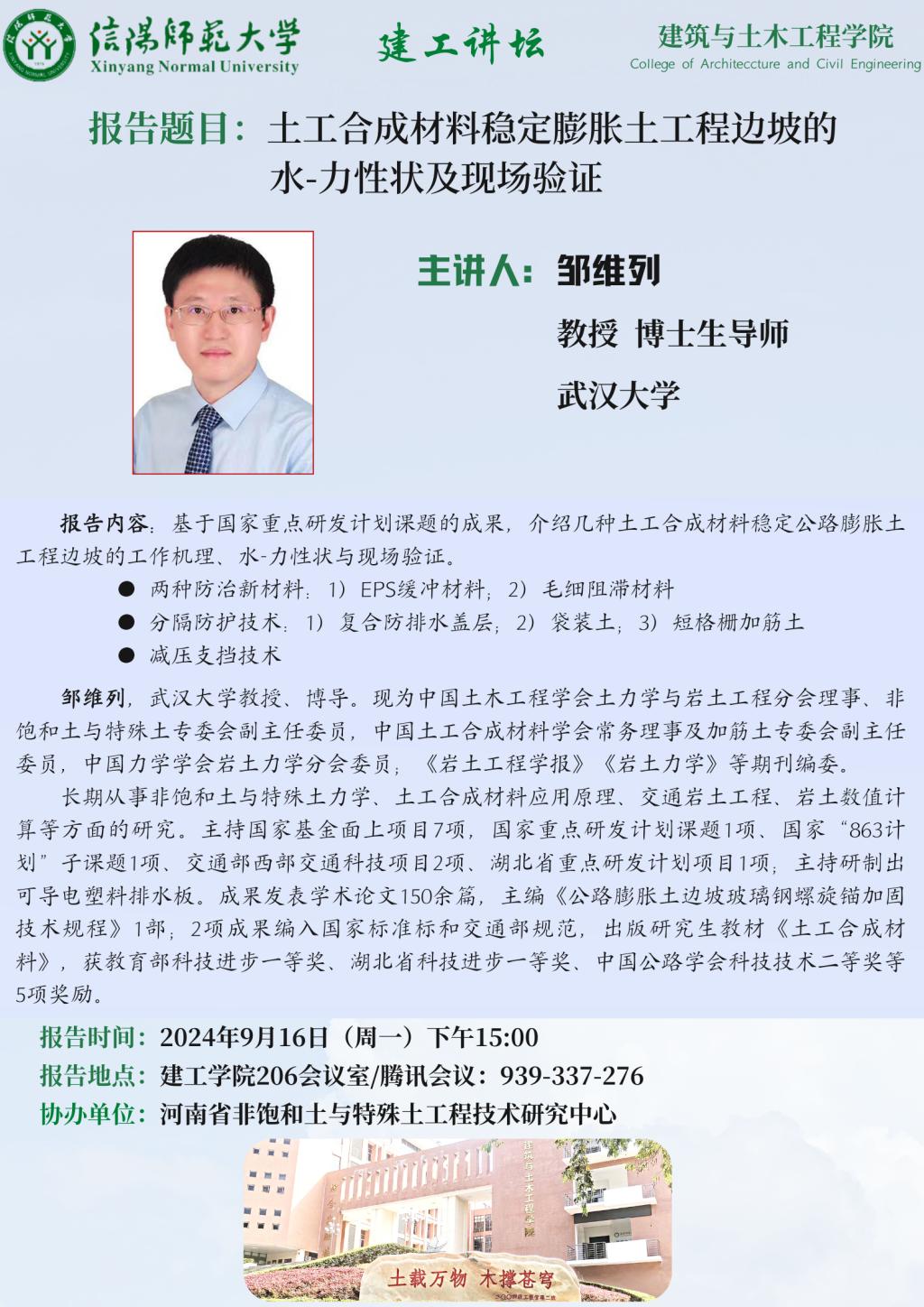报告人简介:邹维列,武汉大学教授、博导。现为中国土木工程学会土力学与岩土工程分会理事、非饱和土与特殊土专委会副主任委员,中国土工合成材料学会常务理事及加筋土专委会副主任委员,中国力学学会岩土力学分会委员;《岩土工程学报》《岩土力学》等期刊编委。长期从事非饱和土与特殊土力学、土工合成材料应用原理、交通岩土工程、岩土数值计算等方面的研究。主持国家基金面上项目7项,国家重点研发计划课题1项、国家“863计划”子课题1项、交通运输部西部交通科技项目2项、湖北省重点研发计划项目1项;主持研制出可导电塑料排水板。成果发表学术论文150余篇,主编《公路膨胀土边坡玻璃钢螺旋锚加固技术规程》1部;2项成果编入国家标准标和交通运输部规范,出版研究生教材《土工合成材料》,获教育部科技进步一等奖、湖北省科技进步一等奖、中国公路学会科技技术二等奖等5项奖励。