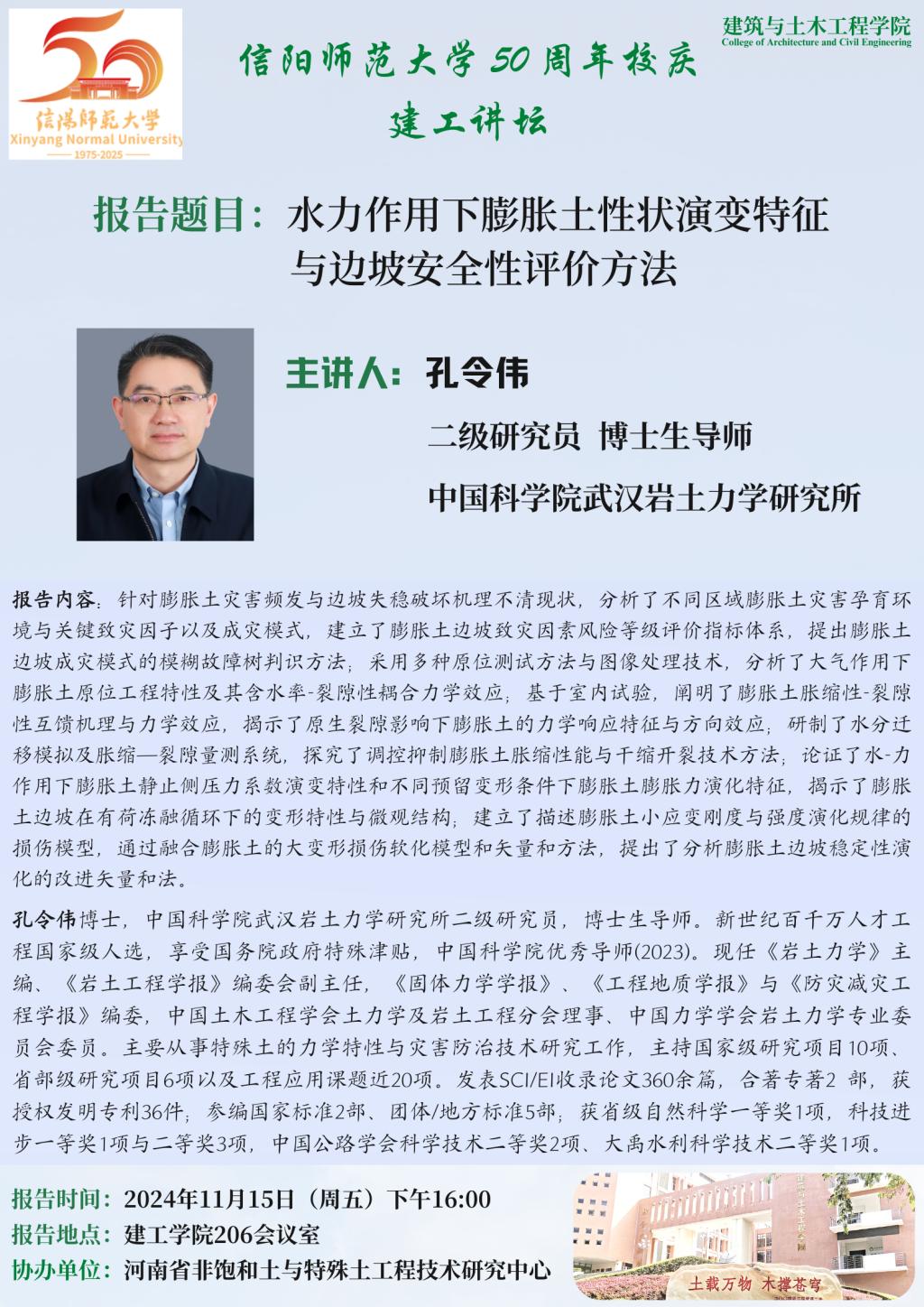 报告人简介:孔令伟博士,中国科公司武汉岩土力学研究所二级研究员,博士生导师。新世纪百千万人才工程国家级人选,享受国务院政府特殊津贴,中国科公司优秀导师(2023)。现任《岩土力学》主编、《岩土工程学报》编委会副主任,《固体力学学报》、《工程地质学报》与《防灾减灾工程学报》,中国土木工程学会土力学及岩土工程分会理事、中国力学学会岩土力学专业委员会委员。主要从事特殊土的力学特性与灾害防治技术研究工作,主持国家级研究项目10项、省部级研究项目6项以及工程应用课题近20项。发表SCI/EI收录论文360余篇,合著专著2 部,获授权发明专利36件;参编国家标准2部、团体/地方标准5部;获省级自然科学一等奖1项,科技进步一等奖1项与二等奖3项,中国公路学会科学技术二等奖2项、大禹水利科学技术二等奖1项。