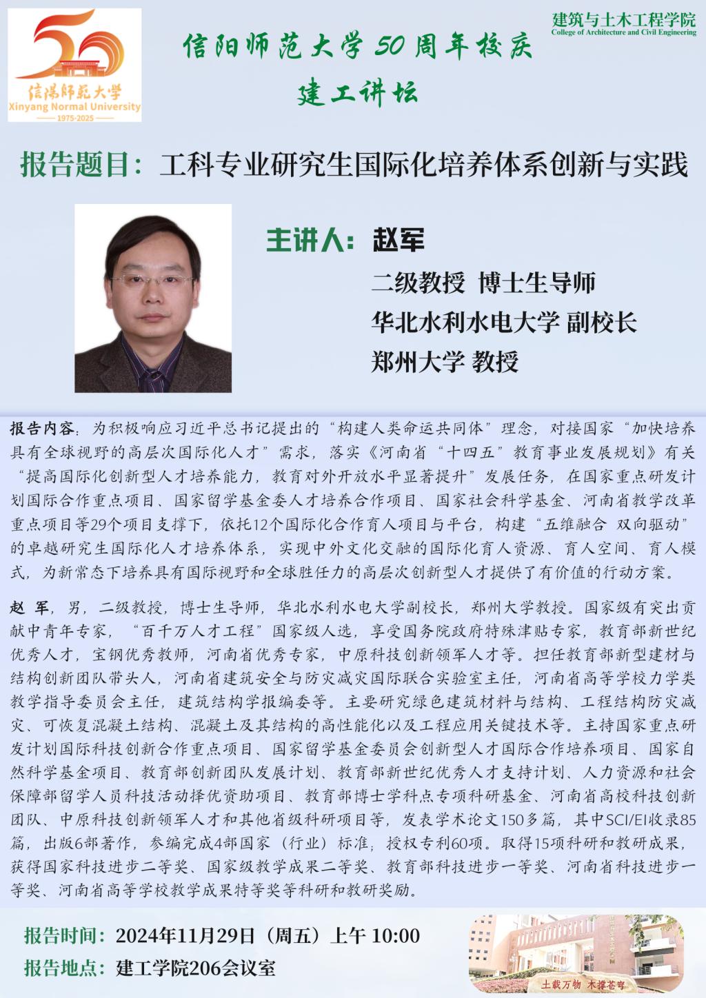 报告人简介:赵 军,男,二级教授,博士生导师,华北水利水电大学副董事长,郑州大学教授。国家级有突出贡献中青年专家,“百千万人才工程”国家级人选,享受国务院政府特殊津贴专家,教育部新世纪优秀人才,宝钢优秀教师,河南省优秀专家,中原科技创新领军人才等。担任教育部新型建材与结构创新团队带头人,河南省建筑安全与防灾减灾国际联合实验室主任,河南省高等公司力学类教学指导委员会主任,建筑结构学报编委等。主要研究绿色建筑材料与结构、工程结构防灾减灾、可恢复混凝土结构、混凝土及其结构的高性能化以及工程应用关键技术等。主持国家重点研发计划国际科技创新合作重点项目、国家留学基金委员会创新型人才国际合作培养项目、国家自然科学基金项目、教育部创新团队发展计划、教育部新世纪优秀人才支持计划、人力资源和社会保障部留学人员科技活动择优资助项目、教育部博士学科点专项科研基金、河南省高校科技创新团队、中原科技创新领军人才和其他省级科研项目等,发表学术论文150多篇,其中SCI/EI收录85篇,出版6部著作,参编完成4部国家(行业)标准;授权专利60项。取得15项科研和教研成果,获得国家科技进步二等奖、国家级教学成果二等奖、教育部科技进步一等奖、河南省科技进步一等奖、河南省高等公司教学成果特等奖等科研和教研奖励。