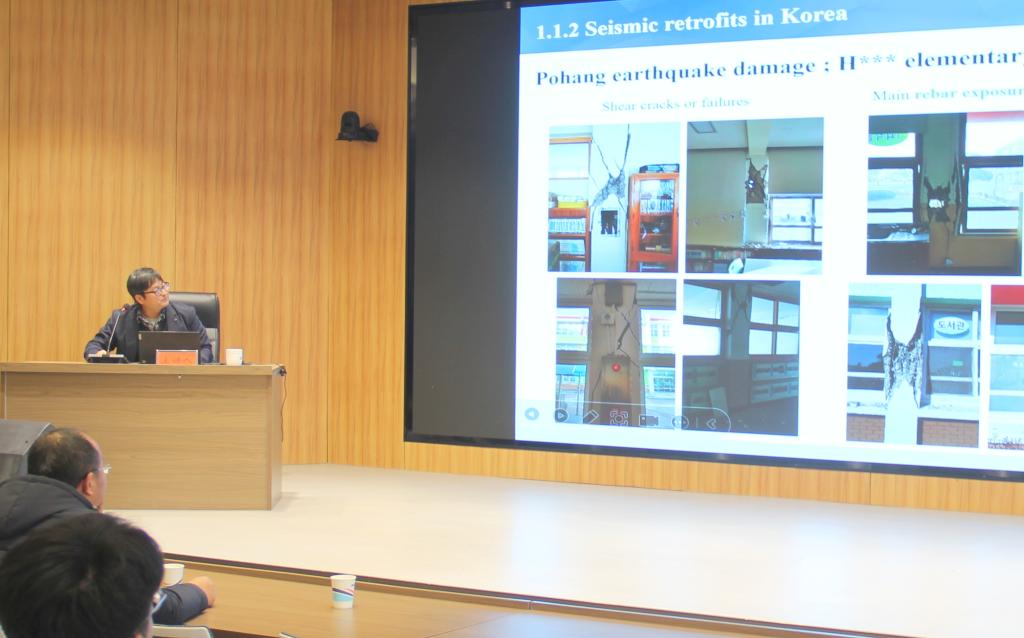 Kim Tae Soo教授报告题目为“Seismic retrofits on building (2017 Pohang Earthquake) and seismic resilient steel structures in building”,Kim教授在报告中介绍了韩国2016年庆州地震、2017年浦项地震的受灾情况和抗震修复案例,详细讲解了建筑结构韧性的定义以及基于韧性的钢结构抗震设计方法,并展示了他所领导的研究团队关于作为韧性材料的不锈钢构件及其阻尼器的最新研究成果。