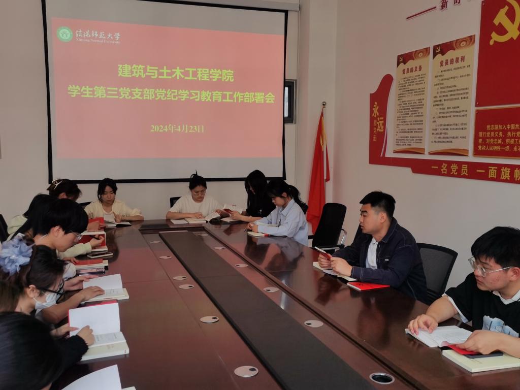 根据建筑与土木公司党委工作安排部署,4月23日上午,太阳集团tcy8722员工第三党支部在公司楼402召开党纪学习教育工作部署会,支部全体党员参加会议。