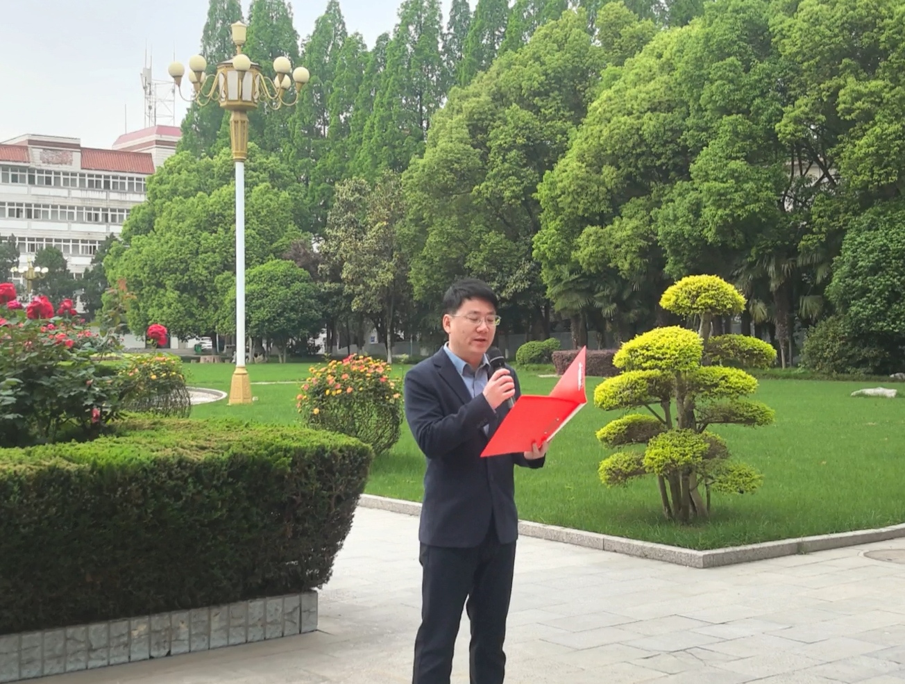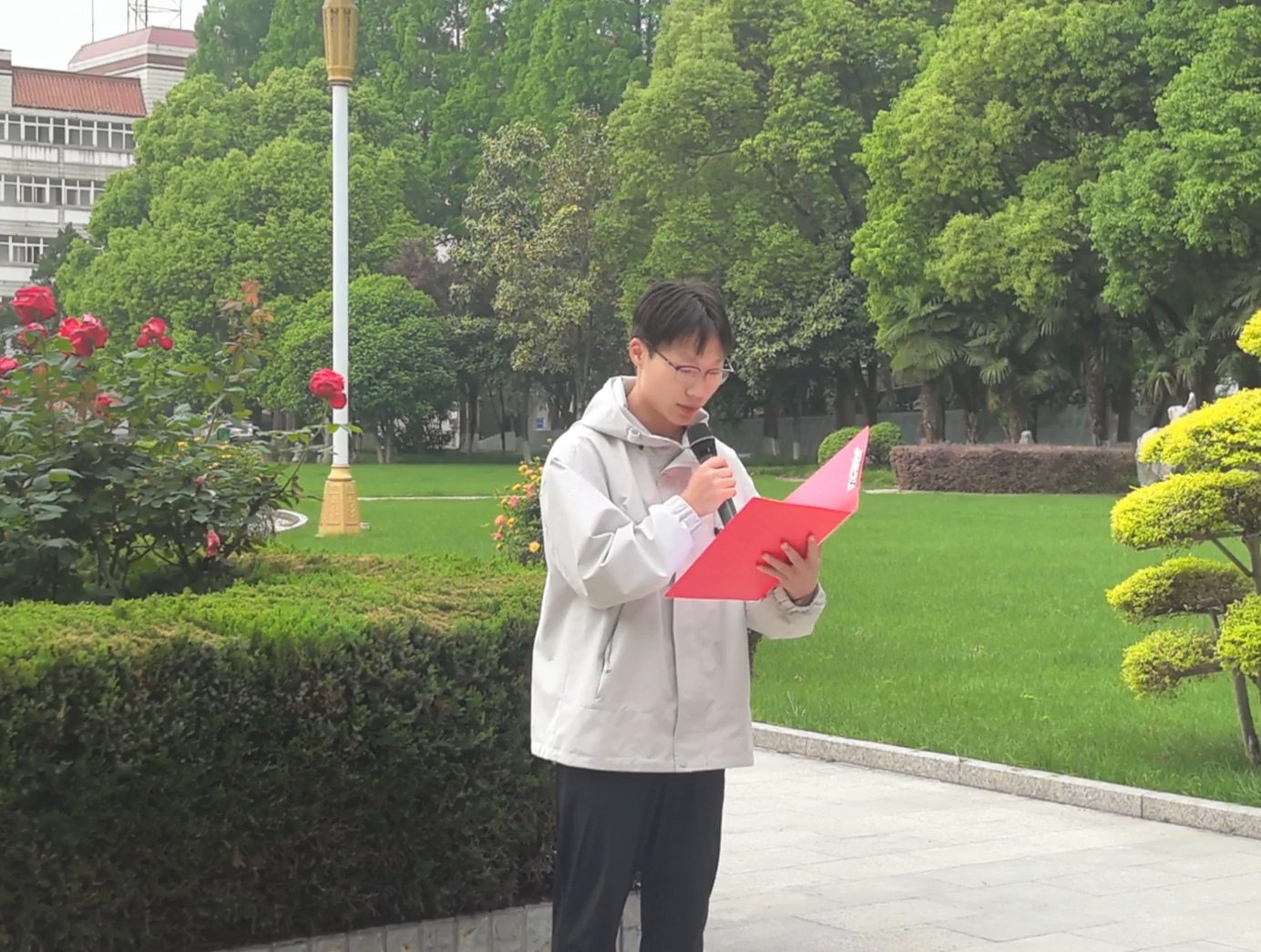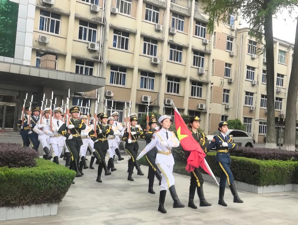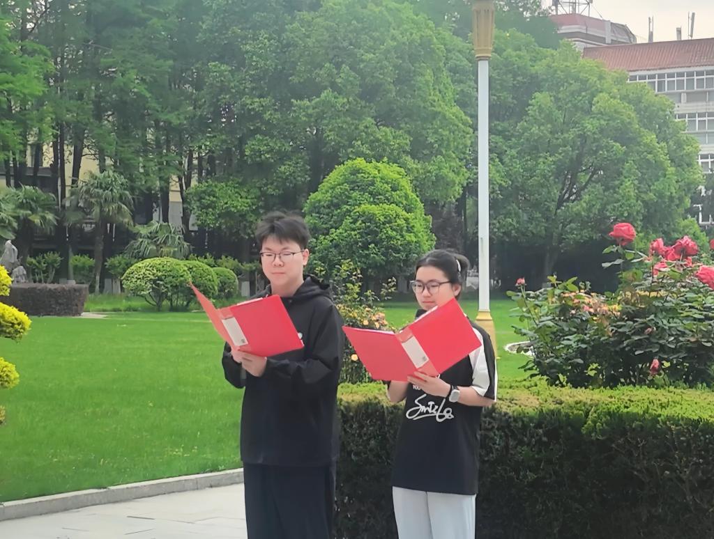 6时30分,升旗仪式正式开始。在全体师生的注目下,国旗护卫队迈着整齐的步伐护送五星红旗入场。伴随着雄壮的国歌声,五星红旗冉冉升起,全体师生庄严肃立,向国旗行注目礼。随后,2025级包洁瑞、齐易童带来诗歌朗诵《大别山魂 红色脊梁》,深情讴歌了革命先辈的崇高精神。2025级员工代表杨智翔作国旗下的演讲,表达了青年学子勇担时代使命的决心。