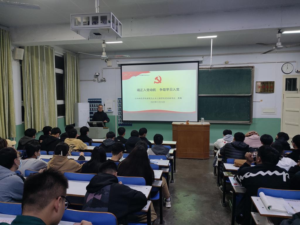 冀鹏以“端正入党动机,争取早日入党”为题做了主题报告。他首先带领同学们回顾了党的百年发展历程,让同学们在抗击疫情、脱贫攻坚和经济社会发展等工作取得的胜利成果中感受中国共产党的伟大,希望同学们能够深入学习“四史”知识,提升理论素养,为入党做好充分的准备。接着,冀鹏通过讲解党员发展程序,激励同学们端正入党动机,坚定理想信念,保持高昂斗志,勤奋刻苦学习,不忘初心,牢记使命,做勇担当、敢担当、能担当的新时代老员工,早日成长为一名合格党员。最后,冀鹏对同学们提出要求,希望同学们深入学习习近平新时代中国特色社会主义思想,坚定不移听党话、跟党走,矢志追求,努力拼搏,坚持按照“讲政治、有信念,讲规矩、有纪律,讲道德、有品行,讲奉献,有作为”的标准严格要求自己,以扎实学识和崇高修养成长为社会主义现代化国家的建设者和接班人。