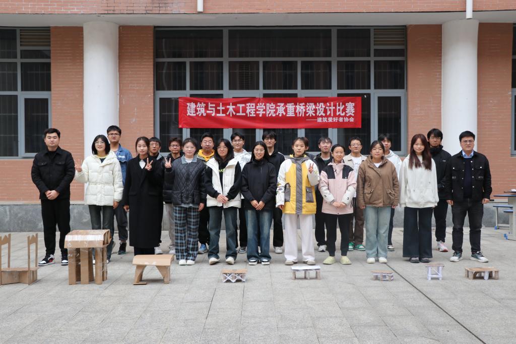 11月23日下午,太阳集团tcy8722建筑爱好者协会在综合实验楼小广场举办承重桥梁设计大赛,公司团委负责人冯舒心,社团指导老师吕强、社团部分员工以及参赛选手参加活动。
