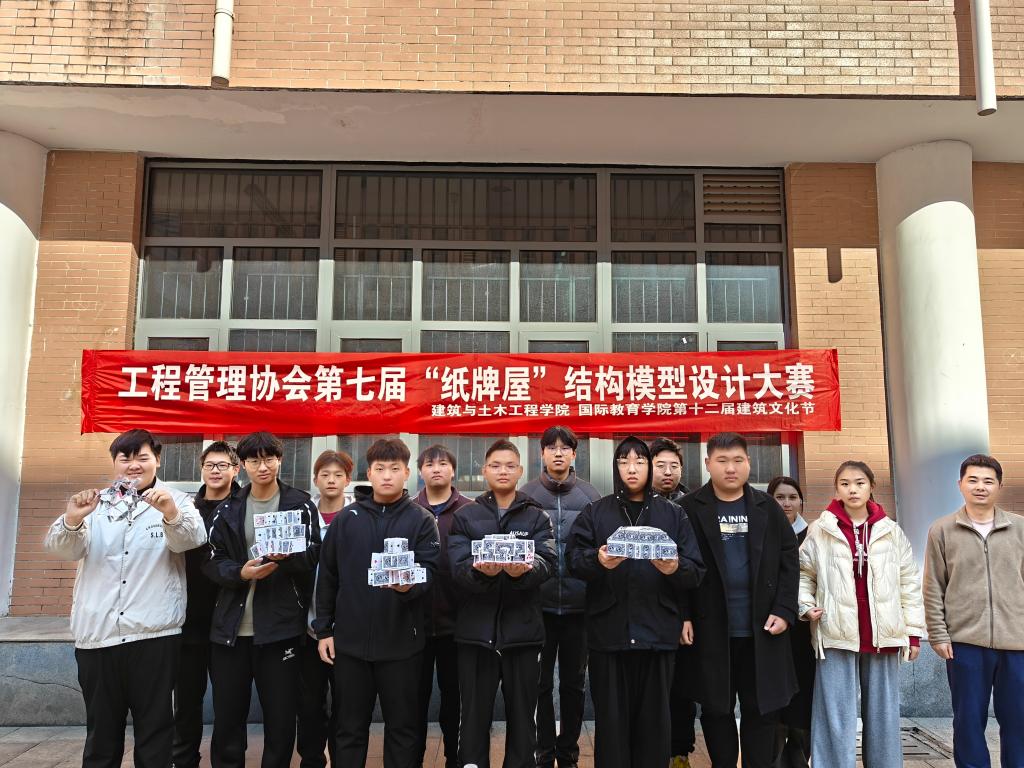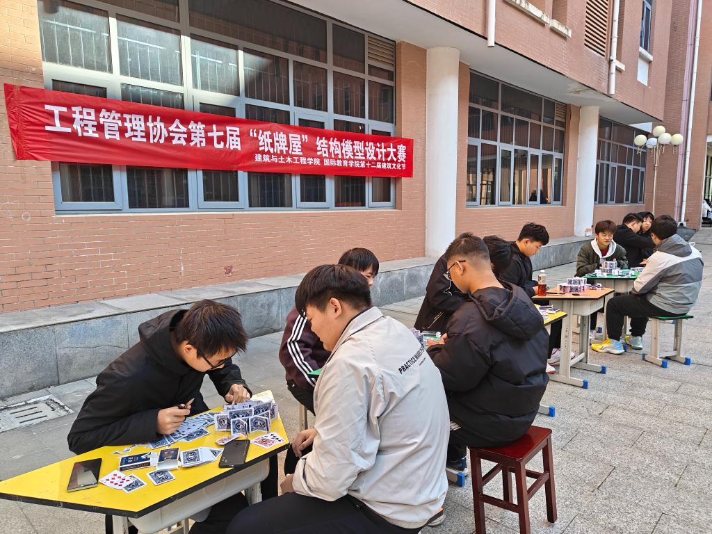 12月1日上午,太阳集团tcy8722在综合实验楼小广场举办第七届“纸牌屋”结构模型设计大赛。工程管理协会指导老师吴志强、社团部分员工以及参赛选手参加活动。