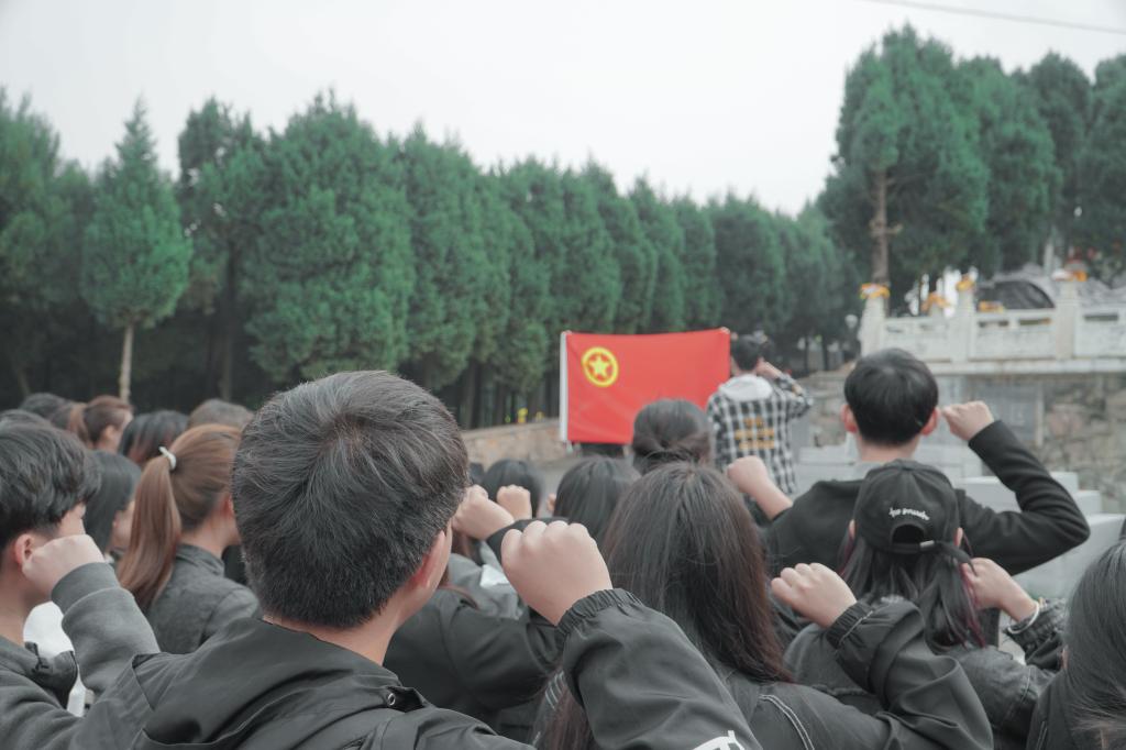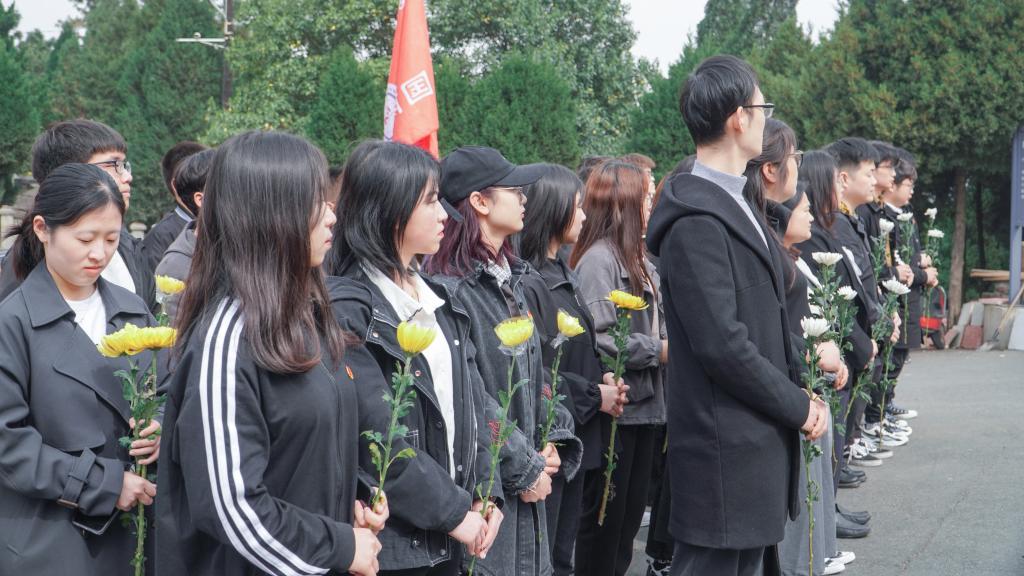 上午九点半,带队老师与同学们乘坐巴士,到达陵园并有序进入。在陵园中央曹灿章将军的纪念碑前,由员工党员王倍起主持的悼念仪式在庄严肃穆的氛围中举行。同学们排成整齐的方阵,向烈士敬献花篮;集体低头默哀一分钟,藉以表达对已逝先贤的致敬与追思;环绕纪念碑一周,献上一朵朵小白花,表达自己对先烈们的敬仰之情。并在青年团员史俊鹏的带领下重温入团誓词,再次接受了思想洗礼,铮铮誓词震撼人心。