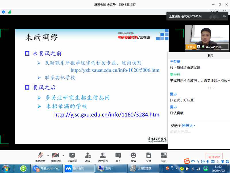 4月22日上午,太阳集团tcy8722专门利用考研指导群和腾讯会议的形式,组织召开了2020届员工考研复试的“云指导”专题课堂。60余名考研学子参加了本次云上指导会。