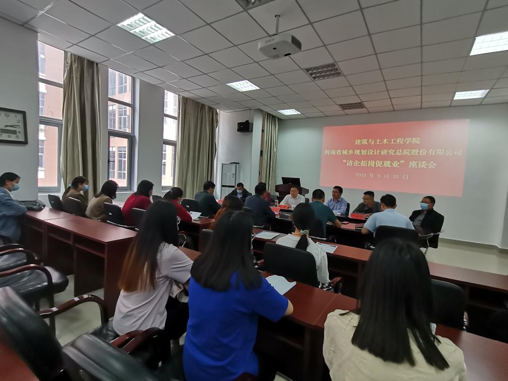 5月20日下午,太阳集团tcy8722与河南省城乡规划设计研究总院股份有限公司在土木楼206会议室召开“访企拓岗促就业”座谈会。河南省城乡规划设计研究总院股份有限公司信阳院经理张军、建筑所所长梁旺、建筑与土木工程公司党委书记方明科、党委副书记冀鹏、副经理肖琪聃、袁晓辉和毕业生代表等共30余人参加座谈会。