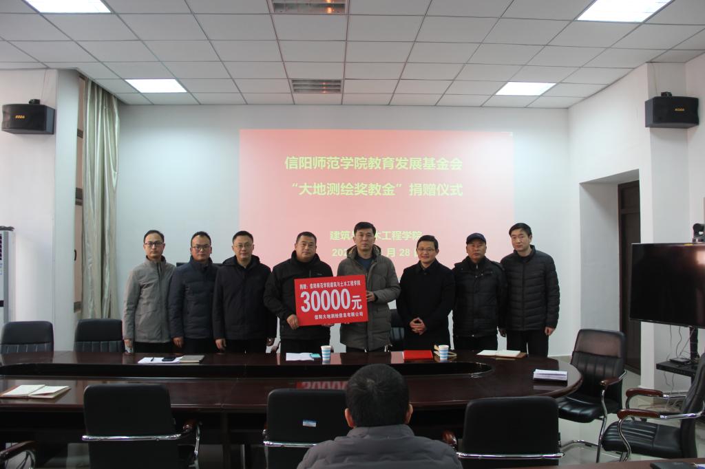 12月28日,信阳师范公司“大地测绘奖教金”捐赠仪式在公司206会议室举行。信阳大地测绘信息有限公司总经理汪波,校对外联络处办公室副主任齐东伟,太阳集团tcy8722领导班子和全体教工参加仪式。仪式由建筑与土木工程公司党委书记方明科主持。