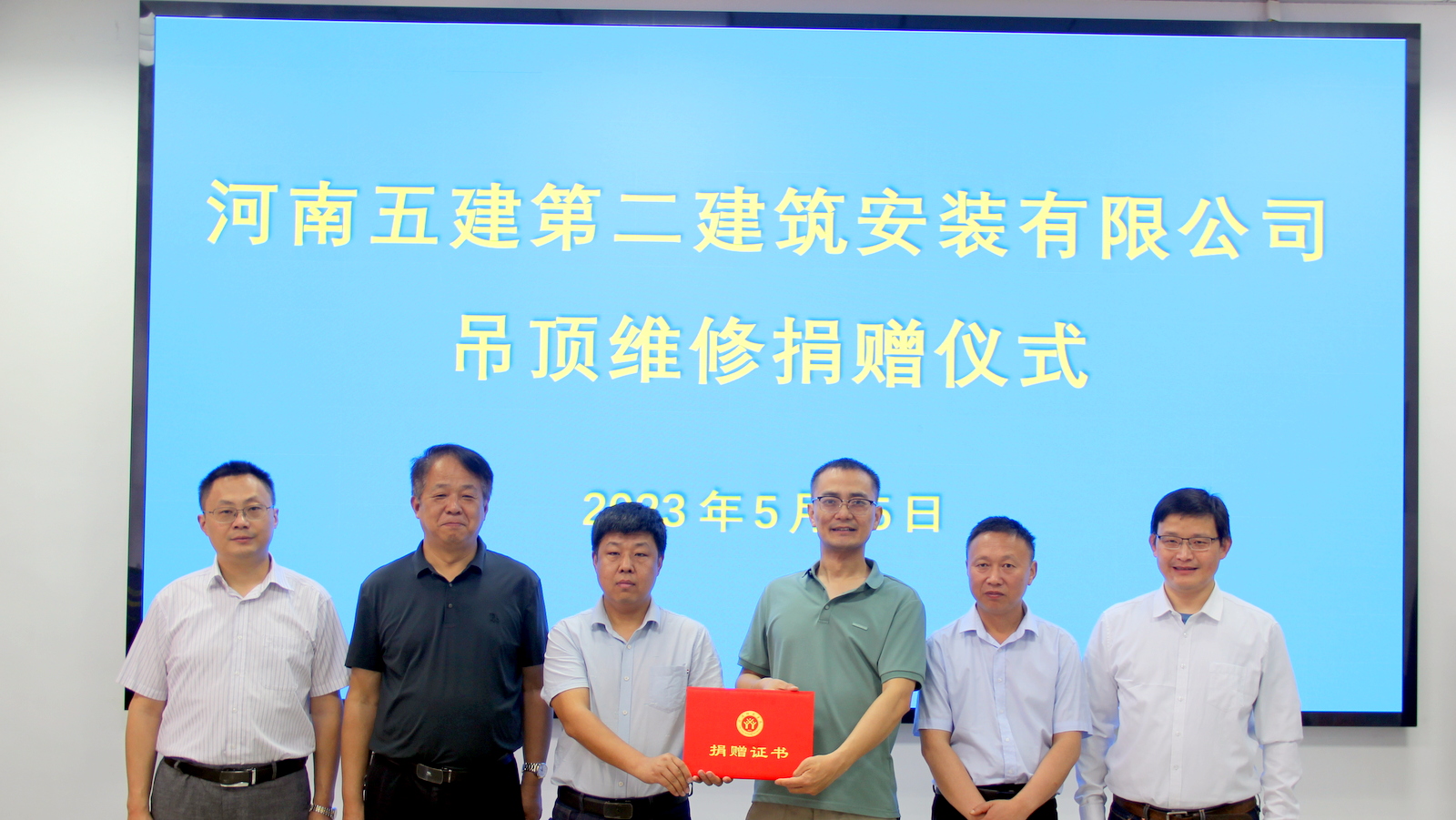 5月15日上午,河南五建第二建筑安装有限公司吊顶维修捐赠仪式在太阳集团tcy8722206会议室举行。河南五建第二建筑安装有限公司副总经理吴建功、总工程师徐礼赞、项目经理贾善磊,公司党委书记方明科、经理周葆春、办公室主任周峰参加了捐赠仪式。