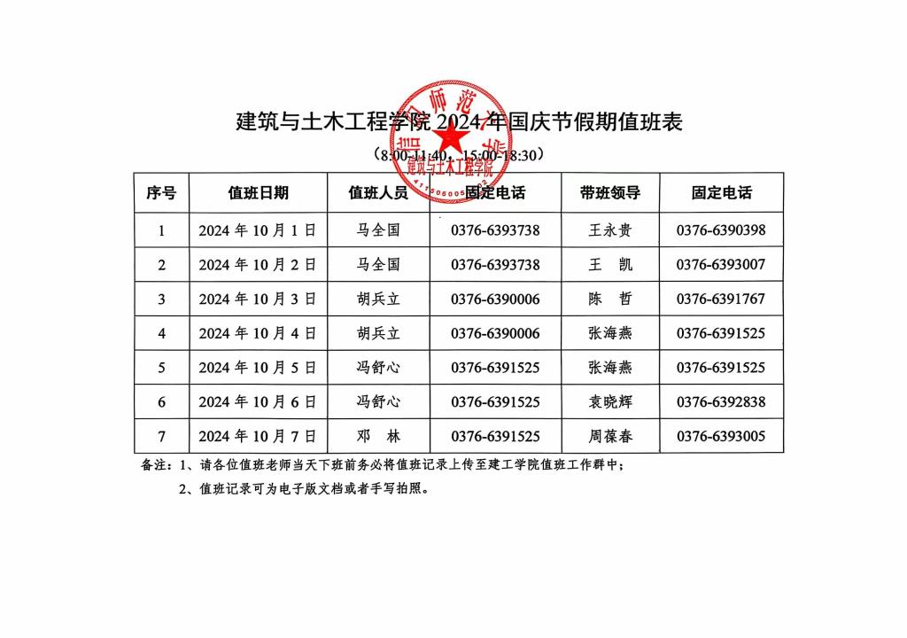2024年国庆节假期值班表